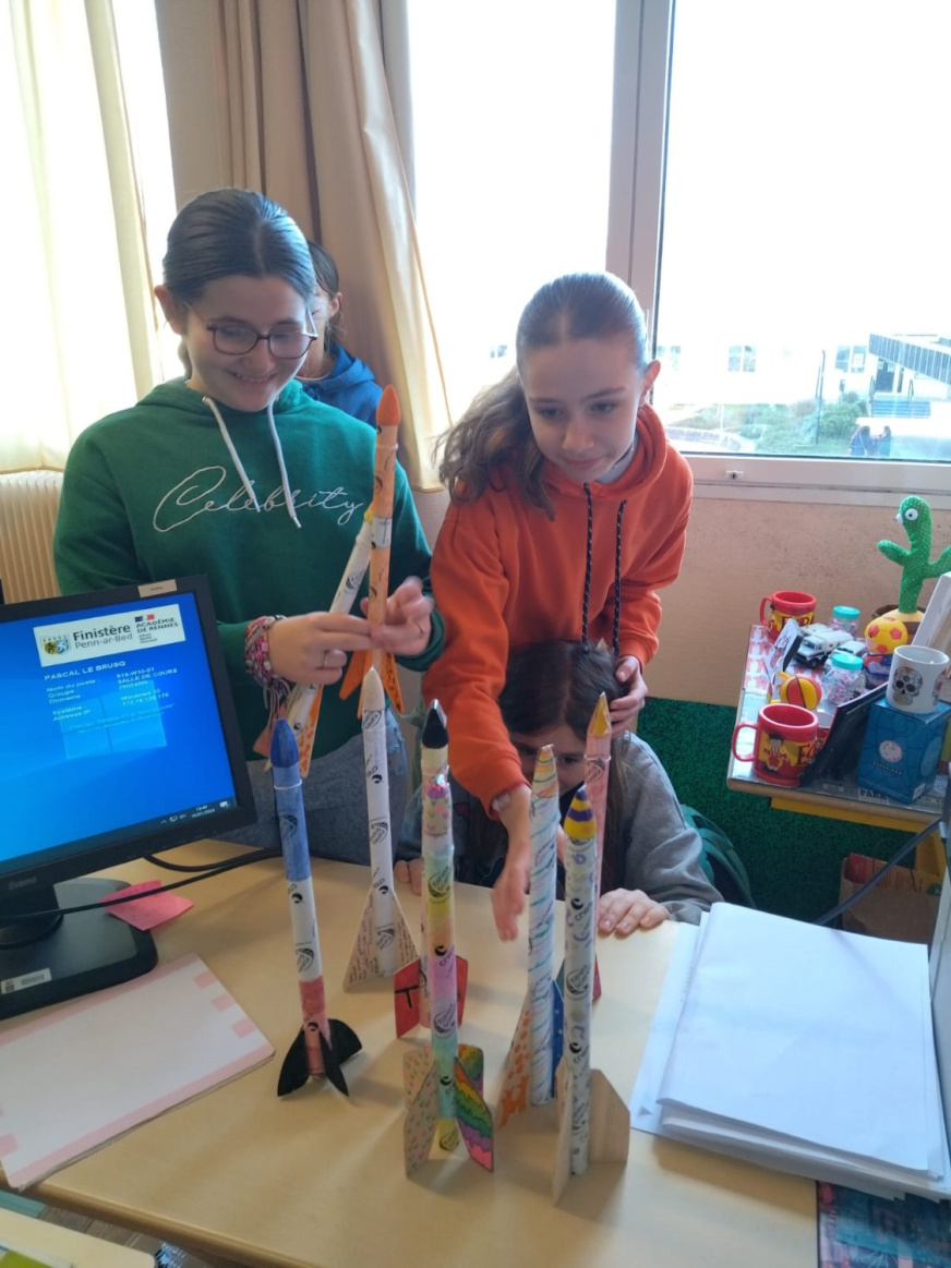Après avoir réalisé des panneaux sur le thème “ Quitter la terre” d’Octobre à début Janvier, le groupe s’est lancé dans la réalisation de micro-fusées avec l’aide de Ronan Perrot président de l’association PEGASE de Saint Renan. La matinée était consacrée à la fabrication en classe.