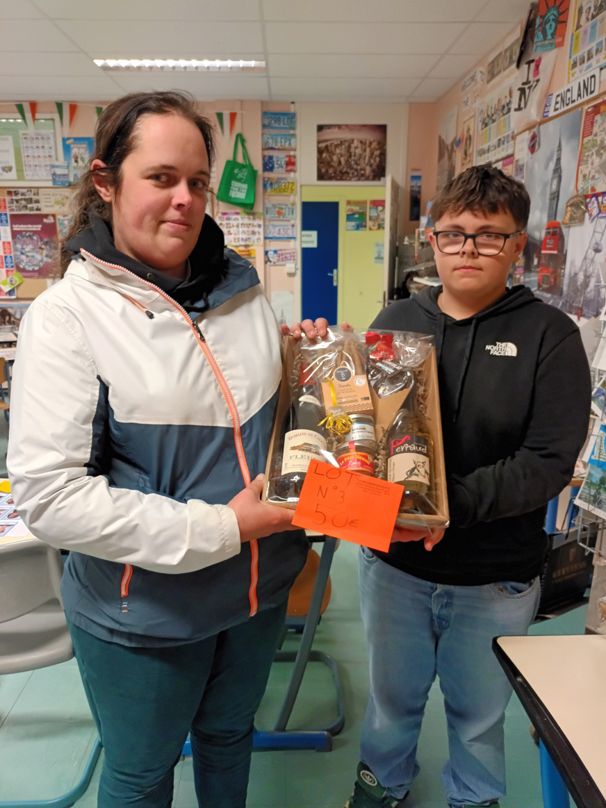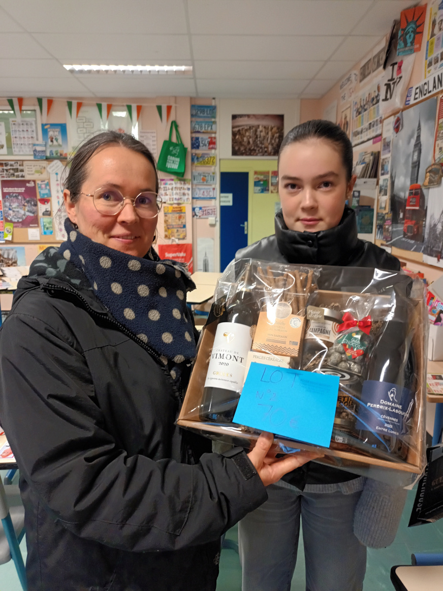 Une main innocente (un futur élève de 6e) accompagné de Mathilde et Yaëlle, nos « assistantes » (élèves de 4e 4) a accepté de tirer au sort les noms des trois gagnants. Ils ont reçu chacun un panier garni d’une valeur de 100 € (1er prix), de 70 € (2e prix) et de 50 € (3e prix). Aussitôt appelés, ils sont venus au collège chercher leur lot. Nous les remercions d’avoir contribué à collecter des fonds pour les voyages et sorties pédagogiques du collège, nous remercions également tous ceux qui ont acheté des billets de tombola et n’ont pas été aussi chanceux qu’eux et enfin, un grand merci à tous nos élèves qui ont bien voulu donner de leur temps pour vendre les billets !