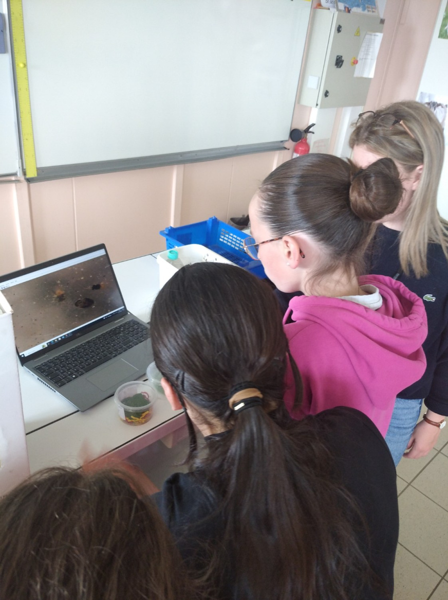 Après avoir revu les caractéristiques des insectes, Vincent a présenté aux élèves les cultures sous serre. Ces serres, nombreuses dans la région qui nous questionnent toujours…il y a quoi dedans ? Pourquoi il y a des lumières roses ? Pourquoi, il n’y a pas de terre au sol ? Les élèves ont pu avoir réponses à leurs questions. Pas toujours simple de cultiver des tomates, des fraises, à cause des insectes ravageurs mais heureusement macrolophus et encarsia sont là…et ils vont venir en aide pour éliminer les mouches blanches. Ainsi, les méthodes de lutte biologique mises en place dans les serres, permettent d’éviter l’utilisation des pesticides. Vincent a illustré la notion de coopération avec l’exemple de la pollinisation et a abordé la photosynthèse que les élèves reverront en cours l’an prochain en 5e. En fin de séance, les élèves ont pu observer la ruche et ses occupants et grâce à la caméra microscope, ils ont appris à reconnaitre les différents insectes ravageurs et protecteurs. Une intervention riche qui permet aux élèves d’échanger avec un spécialiste, de nourrir leur curiosité sur le monde des insectes et de voir que des anciens élèves de Lesneven deviennent médiateurs scientifiques.
