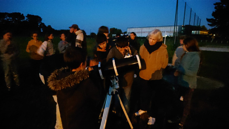Mardi soir, 20 septembre 2022, petits et grands aventuriers de l’atelier « La Tête dans les étoiles » en ont pris plein les yeux grâce à « Pégase » ! L’association d’astronomie, basée sur Saint-Renan, était représentée par son Président Monsieur Ronan Perrot, et deux autres passionnés de l’observation spatiale. Rendez-vous était donné pour l’observation à 20h30 sur le stade Georges Martin derrière le collège. A l’heure pile, nos explorateurs, actuellement en classe de 5e, chaudement équipés et accompagnés de quelques parents tout aussi curieux, sont arrivés, ravis d’avoir obtenu la permission de minuit ! Monsieur Perrot avait installé sur le terrain deux télescopes de moyenne portée, mais dont la particularité est d’offrir à l’oeil curieux (s’il se pose au bon endroit !) une vision bien nette des objets célestes visés. Pour compléter le dispositif, Madame Rozec, avait également mis à la disposition des observateurs le télescope du collège, et un papa avait également apporté le sien.