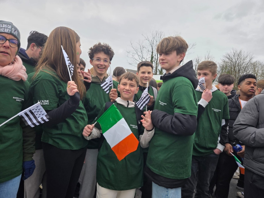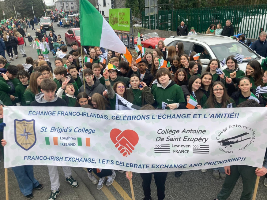 Dans le cadre de l’échange entre le collège Saint Exupéry de Lesneven et St Brigid School de Loughrea en Irlande, 49 élèves de 3e ont défilé avec leurs correspondants pour la Parade de la Saint Patrick.